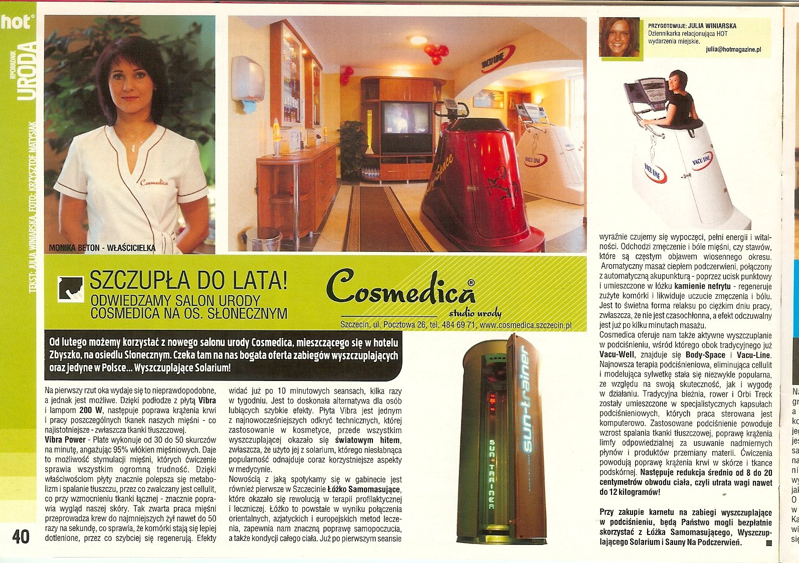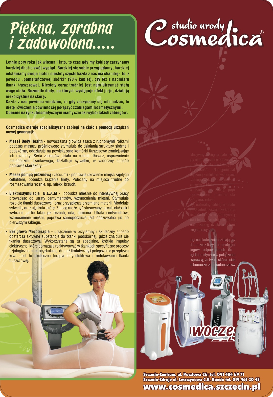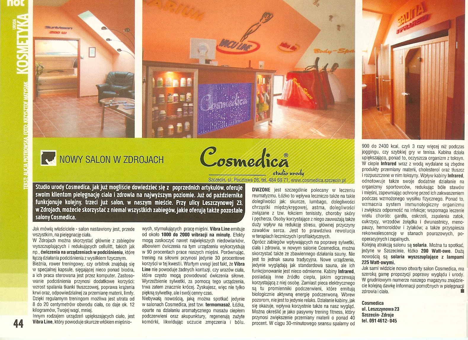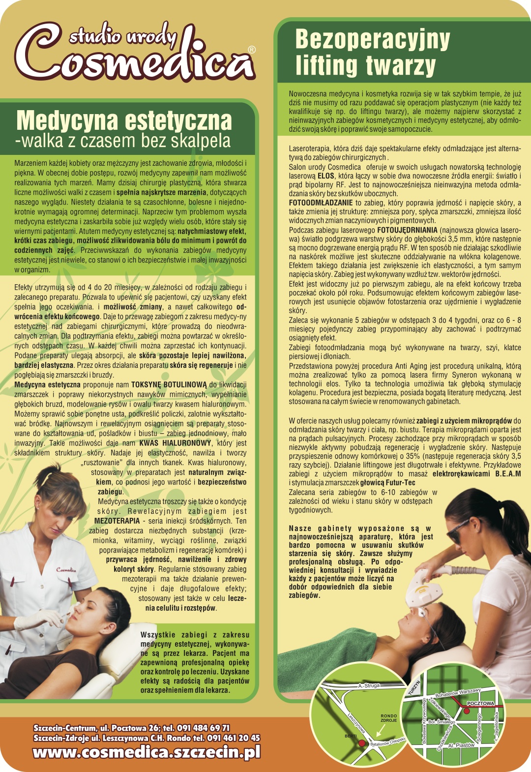 Cosmedica – Gabinet Kosmetologii Estetycznej, mieszcząca się w centrum i na prawobrzeżu Szczecina, powstała w 2003 roku z zamiarem świadczenia najwyższej jakości usług w dziedzinie kosmetologi, medycyny estetycznej, wyszczuplania, opalania oraz innych dziedzinach mających na celu upiększanie i poprawę samopoczucia oraz zdrowia naszych klientów poprzez estetyczny i zdrowy wygląd skóry.