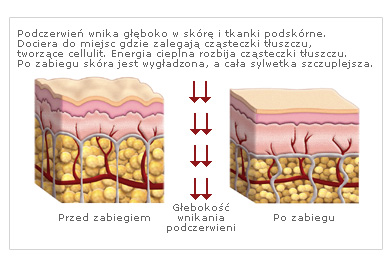 Działanie podczerwieni stosowane jest z dużym powodzeniem na całym świecie w chorobach przewlekłych i różnego rodzaju urazach. Promienie podczerwieni oczyszczają skórę i tkanki podskórne za zbędnych toksyn, czego efektem jest jędrna, czysta, zdrowa skóra. Idea piękna płynącego z wnętrza jest tu jak najbardziej na miejscu, gdyż to właśnie nowa, zdrowa skóra zastępuje starą, złuszczającą się i zatrutą toksynami. Regularne wizyty w takiej kapsule mają także pozytywny wpływ n a zmniejszenie cellulitu. Promienie podczerwone są również stosowane na szeroką skalę dla celów medycznych, jako środek relaksacyjny i antystresowy.